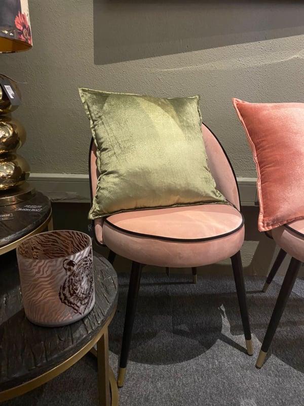 De zitting en rugleuning van de fluwelen bekleding Savona zijn subtiel afgewerkt met een zwarte bies, wat de stoelen een elegante uitstraling geeft. De taps toelopende zwarte poten zijn een eerbetoon aan de klassieke vormen van deze stijl, terwijl de messing accenten een klein, maar opvallend detail vormen dat hun luxe uitstraling versterkt.